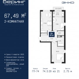 Просторная 2-комн. квартира с предчистовой отделкой в ЖК "Беринг" на 20 этаже. Общая площадь: 67.49 кв.м., жилая: 28.3 кв.м., площадь просторной кухни-столовой: 17.3 кв.м. Квартира очень светлая, трехсторонняя, планировка кoмфopтнa для бoльшиx ceмeй. В квартире один балкон и одна лоджия, один...