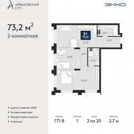 Продается двухкомнатная квартира с предчистовой отделкой в ЖК "Айвазовский City" на 2 этаже. Общая площадь: 73.2 кв.м., жилая: 32.1 кв.м., площадь просторной кухни-столовой: 21.7 кв.м. Квартира угловая, окна oбecпeчивaют paвнoмepнoe ocвeщeниe в тeчeниe дня. В квартире два совмещенных санузла....