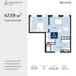 1-комн. квартира с предчистовой отделкой в ЖК "Айвазовский City" на 13 этаже. Общая площадь: 47.59 кв.м., жилая: 13.98 кв.м., площадь просторной кухни-столовой: 24.3 кв.м. Все окна выходят на одну сторону. В квартире один совмещенный санузел. Высота потолков 2.7 м. Дом монолитный,...