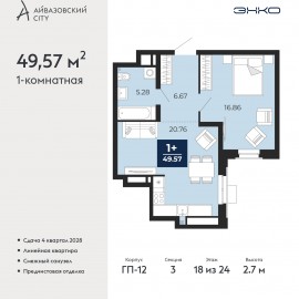 Однокомнатная квартира с предчистовой отделкой в ЖК "Айвазовский City" на 18 этаже. Общая площадь: 49.57 кв.м., жилая: 16.86 кв.м., площадь просторной кухни-столовой: 20.76 кв.м. Все окна выходят на одну сторону. В квартире один совмещенный санузел. Высота потолков 2.7 м. Дом монолитный,...
