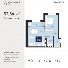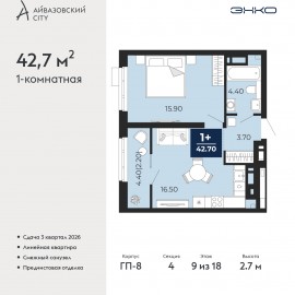 1-комн. квартира от застройщика с предчистовой отделкой в ЖК "Айвазовский City" на 9 этаже. Общая площадь: 42.7 кв.м., жилая: 11.6 кв.м., площадь просторной кухни-столовой: 22.2 кв.м. Все окна выходят на одну сторону. В квартире один совмещенный санузел. Высота потолков 2.7 м. Дом...