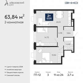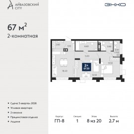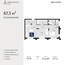 2-комн. квартира от застройщика с предчистовой отделкой в ЖК "Айвазовский City" на 2 этаже. Общая площадь: 67.3 кв.м., жилая: 26 кв.м., площадь просторной кухни-столовой: 18.4 кв.м. Угловая квартира, идеально подойдет любителям тишины и панорамных видов. В квартире одна лоджия, два...