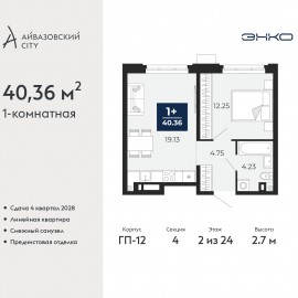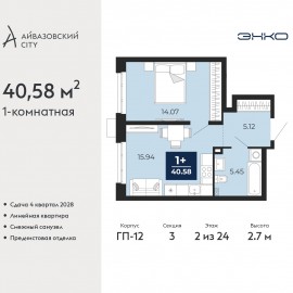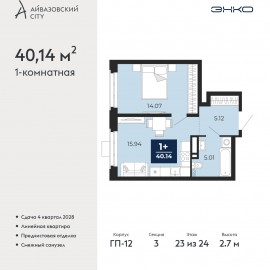 1-комн. квартира от застройщика с предчистовой отделкой в ЖК "Айвазовский City" на 23 этаже. Общая площадь: 40.14 кв.м., жилая: 14.07 кв.м., площадь просторной кухни-столовой: 15.94 кв.м. Все окна выходят на одну сторону. В квартире один совмещенный санузел. Высота потолков 2.7 м. Дом...