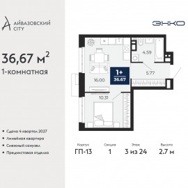 1-комн. квартира с предчистовой отделкой в ЖК "Айвазовский City" на 3 этаже. Общая площадь: 36.67 кв.м., жилая: 10.31 кв.м., площадь просторной кухни-столовой: 16 кв.м. Все окна выходят на одну сторону. В квартире один совмещенный санузел. Высота потолков 2.7 м. Дом монолитный,...