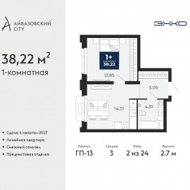 Однокомнатная квартира от застройщика с предчистовой отделкой в ЖК "Айвазовский City" на 2 этаже. Общая площадь: 38.22 кв.м., жилая: 13.85 кв.м., площадь просторной кухни-столовой: 14.51 кв.м. Все окна выходят на одну сторону. В квартире один совмещенный санузел. Высота потолков 2.7 м....