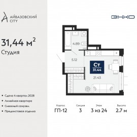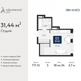 1-комн. квартира-студия с предчистовой отделкой в ЖК "Айвазовский City" на 18 этаже. Общая площадь: 31.44 кв.м., площадь гостиной 21.43 кв.м., из которых 5 кв.м. выделено под кухонную зону. Все окна выходят на одну сторону. В квартире один совмещенный санузел. Высота потолков 2.7 м. Дом...