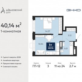 Однокомнатная квартира с предчистовой отделкой в ЖК "Айвазовский City" на 11 этаже. Общая площадь: 40.14 кв.м., жилая: 14.07 кв.м., площадь просторной кухни-столовой: 15.94 кв.м. Все окна выходят на одну сторону. В квартире один совмещенный санузел. Высота потолков 2.7 м. Дом монолитный,...