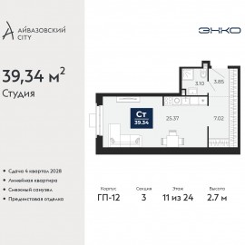 Однокомнатная квартира-студия с предчистовой отделкой в ЖК "Айвазовский City" на 11 этаже. Общая площадь: 39.34 кв.м., площадь гостиной 26.37 кв.м., из которых 6 кв.м. выделено под кухонную зону. Все окна выходят на одну сторону. В квартире один совмещенный санузел. Высота потолков 2.7 м....
