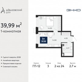 1-комн. квартира от застройщика с предчистовой отделкой в ЖК "Айвазовский City" на 2 этаже. Общая площадь: 39.99 кв.м., жилая: 14.69 кв.м., площадь просторной кухни-столовой: 14.88 кв.м. Все окна выходят на одну сторону. В квартире один совмещенный санузел. Высота потолков 2.7 м. Дом...