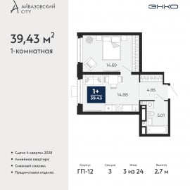 1-комн. квартира с предчистовой отделкой в ЖК "Айвазовский City" на 3 этаже. Общая площадь: 39.43 кв.м., жилая: 14.69 кв.м., площадь просторной кухни-столовой: 14.88 кв.м. Все окна выходят на одну сторону. В квартире один совмещенный санузел. Высота потолков 2.7 м. Дом монолитный,...