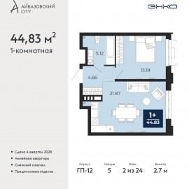 1-комн. квартира с предчистовой отделкой в ЖК "Айвазовский City" на 2 этаже. Общая площадь: 44.83 кв.м., жилая: 13.18 кв.м., площадь просторной кухни-столовой: 21.87 кв.м. Все окна выходят на одну сторону. В квартире один совмещенный санузел. Высота потолков 2.7 м. Дом монолитный,...