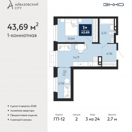 1-комн. квартира от застройщика с предчистовой отделкой в ЖК "Айвазовский City" на 3 этаже. Общая площадь: 43.69 кв.м., жилая: 13.84 кв.м., площадь просторной кухни-столовой: 14.17 кв.м. Все окна выходят на одну сторону. В квартире один совмещенный санузел. Высота потолков 2.7 м. Дом...