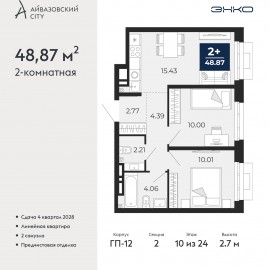 Двухкомнатная квартира от застройщика с предчистовой отделкой в ЖК "Айвазовский City" на 10 этаже. Общая площадь: 48.87 кв.м., жилая: 20.01 кв.м., площадь просторной кухни-столовой: 15.43 кв.м. Комнаты изолированные, все окна выходят на одну сторону. В квартире один совмещенный и один...