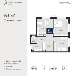 Двухкомнатная квартира от застройщика с предчистовой отделкой в ЖК "Айвазовский City" на 2 этаже. Общая площадь: 63 кв.м., жилая: 28.66 кв.м., площадь просторной кухни-столовой: 16.22 кв.м. Квартира угловая, очень светлая, естественная вентиляция при открытии окон. В квартире один...