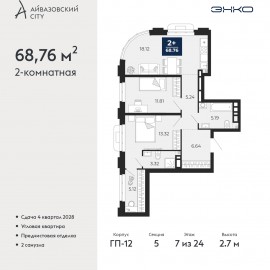 2-комн. квартира с предчистовой отделкой в ЖК "Айвазовский City" на 7 этаже. Общая площадь: 68.76 кв.м., жилая: 25.13 кв.м., площадь просторной кухни-столовой: 18.12 кв.м. Квартира угловая, идеально подойдет любителям тишины и панорамных видов. В квартире два совмещенных санузла. Высота...