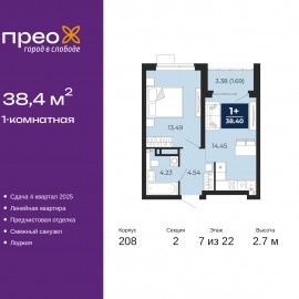 1-комн. квартира с предчистовой отделкой в ЖК "Прео" на 7 этаже. Общая площадь: 38.4 кв.м., жилая: 13.49 кв.м., площадь просторной кухни-столовой: 14.45 кв.м. Все окна выходят на одну сторону. В квартире одна лоджия, один совмещенный санузел. Высота потолков 2.7 м. Дом монолитный,...