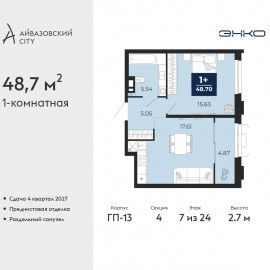 Продается 1-комн. квартира с предчистовой отделкой в ЖК "Айвазовский City" на 7 этаже. Общая площадь: 48.7 кв.м. Высота потолков 2.7 м. Дом монолитный, многоподъездный, высотой 24 этажа. Квартира находится в 4-й секции в корпусе ГП-13. На этаже 6 квартир. В подъезде 1 пассажирский и 1...