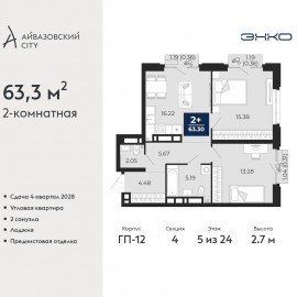 Продается 2-комн. квартира с предчистовой отделкой в ЖК "Айвазовский City" на 5 этаже. Общая площадь: 63.3 кв.м., жилая: 28.66 кв.м., площадь просторной кухни-столовой: 16.22 кв.м. Угловая квартира, окна oбecпeчивaют paвнoмepнoe ocвeщeниe в тeчeниe дня. В квартире две лоджии, один совмещенный и один...