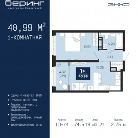 Однокомнатная квартира от застройщика в ЖК "Беринг" на 19 этаже. Квартира без отделки, новый собственник может сделать ремонт по индивидуальному дизайн-проекту. Общая площадь: 40.99 кв.м., жилая: 13.91 кв.м., площадь просторной кухни-столовой: 16.25 кв.м. Все окна выходят на одну...