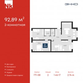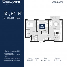 2-комн. квартира с предчистовой отделкой в ЖК "Беринг" на 6 этаже. Общая площадь: 55.94 кв.м. Высота потолков 2.72 м. Дом монолитный, многоподъездный, переменной этажности, от 17 до 24 этажей. Квартира находится в 7-й секции высотой 19 этажей в корпусе ГП-75. На этаже 7 квартир. В подъезде...