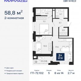 Просторная двухкомнатная квартира с предчистовой отделкой в ЖК "Мириады" на 8 этаже. Общая площадь: 58.8 кв.м. Высота потолков 2.7 м. Дом монолитный, многоподъездный, переменной этажности, от 14 до 16 этажей. Квартира находится в 5-й секции высотой 14 этажей в корпусе ГП-72.102. На...